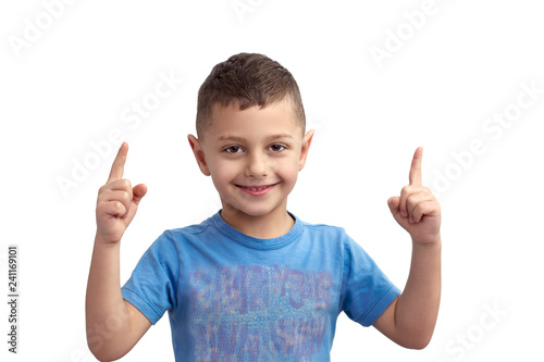 Emotions of a cheerful boy who is holding two fingers up isolated on white background