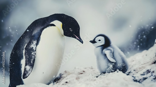 Emperor Penguin Parent and Chick in Snowy Habitat - Wildlife Photo