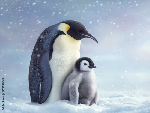 Emperor penguin standing protectively beside its fluffy chick in a snowy landscape, showcasing the bond between parent and offspring in a cold environment