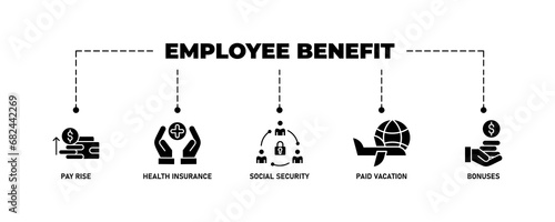 Employee benefits banner web icon vector illustration concept with icon of pay raise, health insurance, social security, paid vacation and bonuses