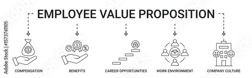 Employee Value Proposition banner with compensation, benefits, career opportunities, work environment, company culture icon set