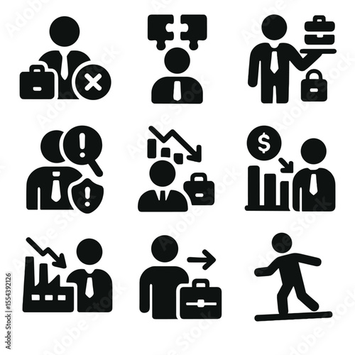 Employment Challenge Icons. Solid, filled icons set of employment challenges: job loss, skill gap,
