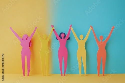 paper, people, figure, colourful, celebration, oneness, togetherness, teamwork, community, support, group, diversity, inclusion, success, achievement, joy, vibrant, bright, cheerful, optimistic, positive, uplifting, hopeful, playful, fun, creative, artistic, design, cut-out, woman, female, sisterhood, empowerment, solidarity, friendship, connection, happiness, strong, confident, standing, hand, raised, linked, joined, silhouette, background, yellow, pink, orange