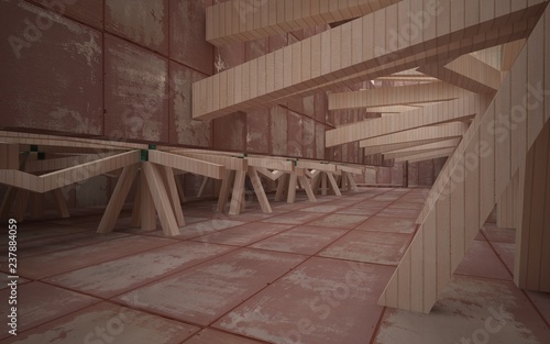 Empty abstract room interior of sheets rusted metal with wood and blue glass. Architectural background. 3D illustration and rendering