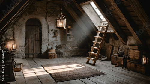 Empty Attic Room with Wooden Beams, Lantern and Ladder, Vintage Interior Design