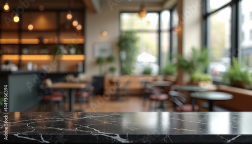 Empty black marble table with blurred cafe background. Bar, restaurant interior, display product, product placement. Blurred bokeh lights and copy space, luxury design for advertisement and business.