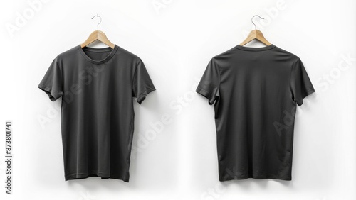 black, t-shirt, empty, plain, hanger, white, background, front, back, view, garment, fabric, smooth, texture
