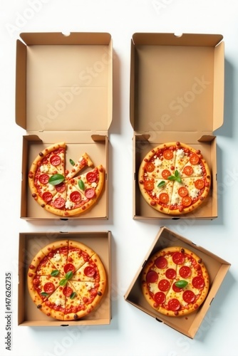 Empty cardboard pizza boxes, various sizes, white background, container, stack