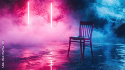 chair, empty, room, neon, light, pink, blue, smoke, fog, dark, mysterious, background, scene, studio, single, object, floor, space, atmosphere, vibrant, colourful, abstract, design, concept, modern, style, texture, image, graphic, illustration, art, photo, light, colours, mood, feeling, lonely, solitude, waiting, suspense, mystery, intrigue, dramatic, effect