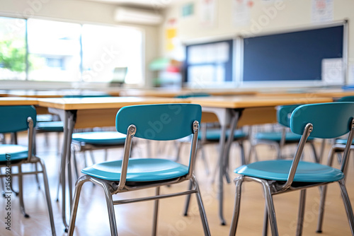 Empty Classroom : The image shows rows of desks and chairs, illuminated by natural light. a chalkboard and windows provide a glimpse into a study setting.