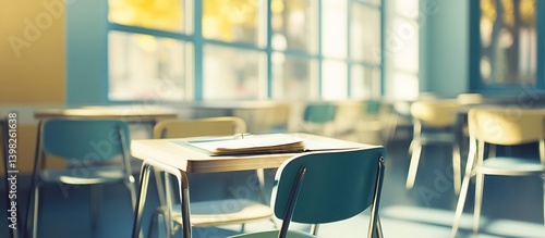 classroom, desk, chair, school, education, learning, student, empty, room, table, window, light, sun, bright, interior, building, space, furniture, seat, surface, lesson, study, cognition, textbook, paper, book, design, architecture, background, modern, old, vintage, clean, calm, peaceful, simple, minimal, aesthetic, atmosphere, comfort, style, view