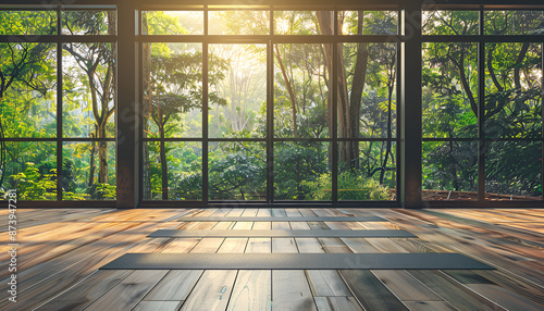 Empty clean yoga gym room studio interior with big windows mats on wooden floor. Place for yoga exercises group meditation practices retreats sessions background in natural forest garden area building