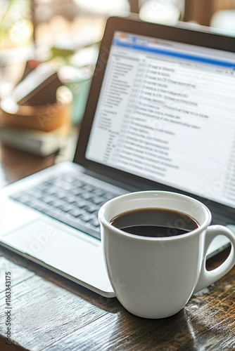hot drink, mug, empty, laptop, electronic mail, inbox, office, workspace, work, desk, morning, digital, technology, productivity, screen, workplace, casual attire, routine, computer, professional, organisation, sharpened, business, online, break, working, corporate, communication, daily, multitask, tied-up, everyday, job