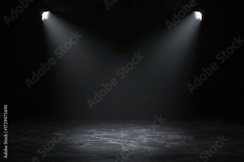 Empty dark stage with white spotlight, smoky atmosphere and marble floor for product display