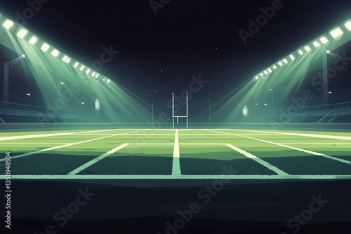 football stadium, standing, goalpost, sport, field, playing, night, illuminated, artificial, light, gridiron, spotlight, competition, recreation, green, white, dark, empty, illustration, digital, graphic, artwork, art, scene, distance, arena, game, match, event, background, commercial, marketing, advertising, championship, league, sporting, tournament, leisure, entertainment