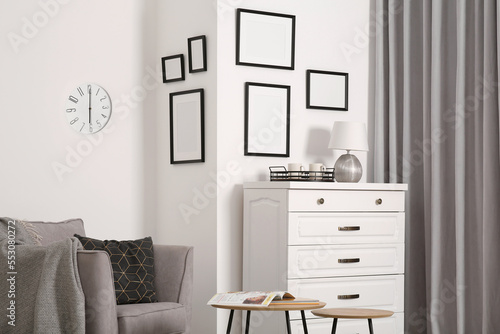Empty frames hanging on white wall, chest of drawers and wooden tables indoors