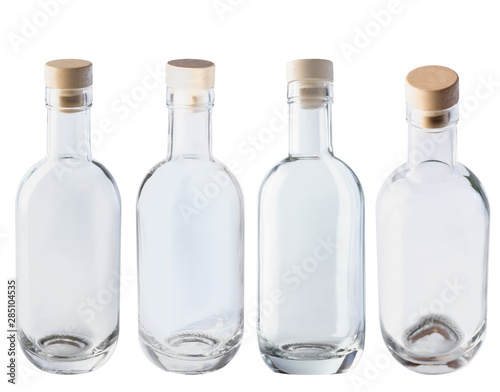 Empty glass bottle with cork. Four different angles. Isolate on a white background. The photo.