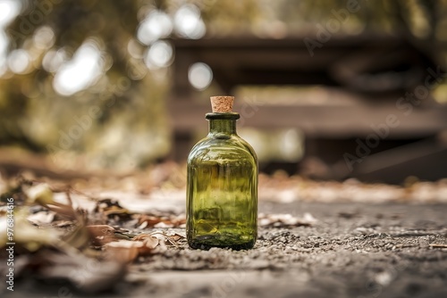 empty green glass bottle on the ground with selective focus.