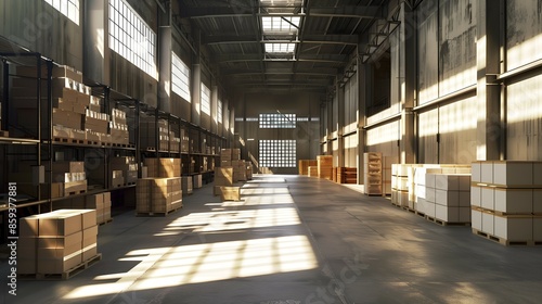 Empty Industrial Warehouse with Pallets of Cardboard Boxes