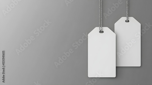 Empty layout layout on grey background. Common blank label name tag hanging on neck with thread