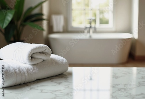 Empty marble table top on blurred minimalistic luxury bathroom at apartment, white day light, clean cozy colors. Place for product display, showing products, side view