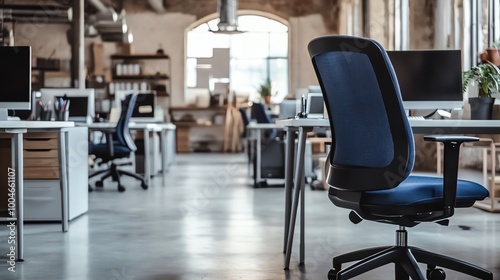 Empty office space with a blue ergonomic chair in the foreground and workstations in the background.