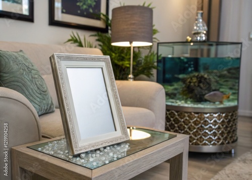 Empty Picture Frame on a Coffee Table in a Modern Living Room with Fish Tank