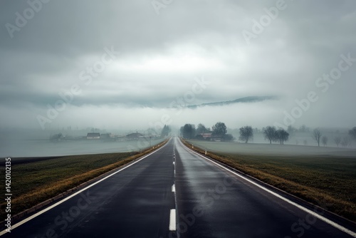 Empty road stretches into thick fog, creating a captivating moody atmosphere in a remote landscape