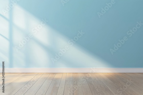 Empty room mockup featuring a baby blue wall and natural wood flooring suitable for various interior design needs