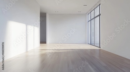 room, empty, interior, design, modern, minimal, white, wall, floor, wooden, wood, sunlight, sun, ray, window, large, glasses, light, bright, roomy, clean, simple, airy, contemporary, minimalist, apartment, loft, office, home, house, studio, blank, background, texture, pattern, architecture, building, real estate, property, commercial, residential, home decor, interior design