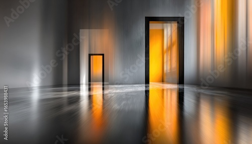 room, door, doorway, orange, light, floor, empty, space, interior, wall, shadow, contrast, minimal, abstract, modern, architecture, design, perspective, line, shape, gleam, shine, glow, bright, dark, grey, black, stillness, quiet, calm, serene, mysterious, enigmatic, hidden, passage, journey, entrance, exit, open, closed, hope, future, path, way, choice, decision, destination