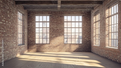Empty room with brick walls and large windows letting in sunlight.