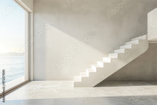 Empty Room with Light Concrete Walls, White Floor, Ocean View Window, Soft Beige Wall, and Staircase, Conveying Tranquility and Minimalism