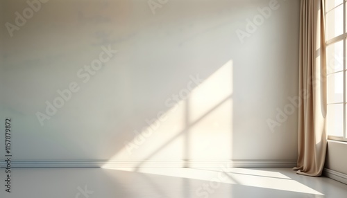 Empty room with white walls, beige curtains by window. Sunlight casts shadows on wall. Modern interior design. Creative studio background template. Perfect for home design ideas product presentations.