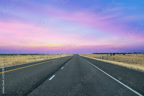 road, highway, sky, travel, asphalt, landscape, nature, horizon, desert, cloud, field, route, long, empty, way, cloud, sun, sunset, car, journey, rural, transportation, line, drive, perspective