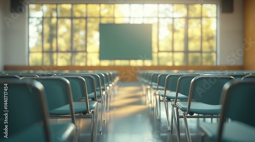 Empty seats in a classroom, symbolizing learning potential and quiet anticipation.