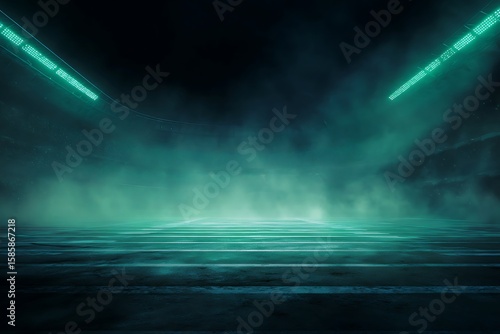 futuristic, effect, atmosphere, room, light, green, design, wall, line, fog, neon, level, stadium, modern, dark, ambience, empty, space, scene, concrete, interior, darkroom, smoky, platform, lighting, smoke, arena, glow, background, illumination
