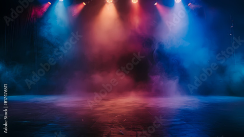 empty, stage, spotlight, drama, beam, purple, blue, pink, red, white, floor, smoke, fog, mysterious, light, concert, party, nightclub, colours, concert hall, abstract, poster, art, decorative, illustration, theme