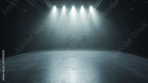 Empty stage with dramatic overhead lighting in a dark theater setting