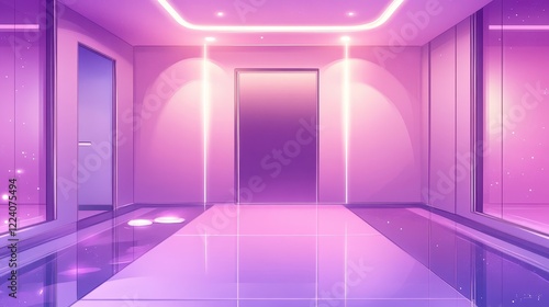 Empty studio space with a gradient lilac ombre wall and floor, featuring a product display podium in the center, surrounded by abstract neon lighting effects.