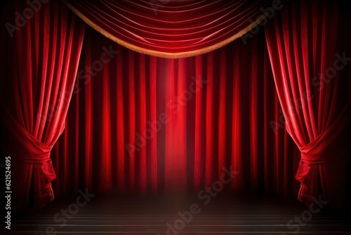 Empty theater stage with red velvet curtains. Red curtains on magic theater stage spotlight show