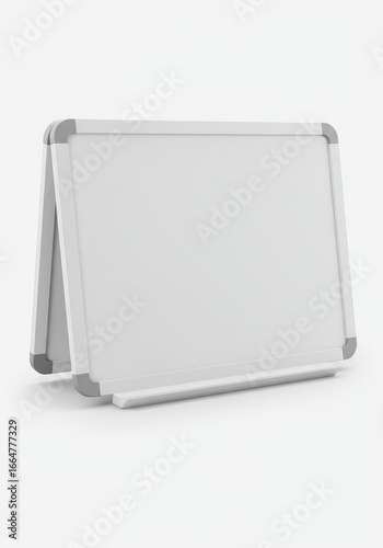 whiteboard, empty, white, grey, frame, portable, adjustable, racked, metal, surface, learning, teaching, classroom, office, meeting, presentation, display, writing, drawing, education, work, modern, simple, clean, minimalist, product, three-dimensional, graphic, design, object, stationary, equipment, tool, school, business, technology, functional, professional, blank, ready, use