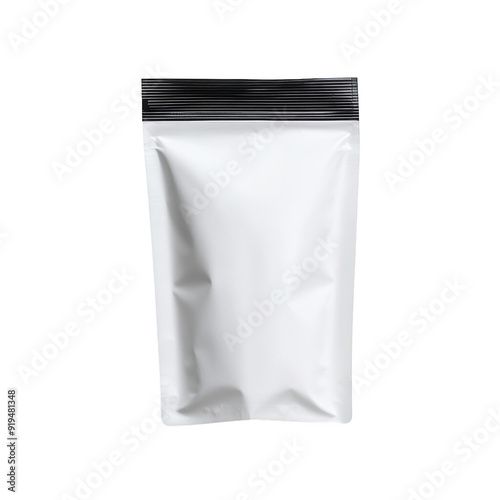 Empty white packaging pouch with a black zipper exhibiting a clean and modern design isolated on a transparent background.