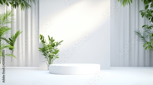 pedestal, display, product, white, empty, plant, green, tropical, minimalist, modern, background, decoration, exhibition, presentation, promotion, lighting, sunlight, texture, smooth, round, cylinder, still life, nature, foliage, calm, clean, minimalism, styling, design, studio, interior, architecture, photo, template, fashion, beauty, cosmetic