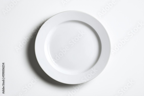 Empty white plate sits on white background. Clean dish ready for food. Top view shows round plate. Simple tableware object. Studio photo. Perfect for restaurant menus, food blogs, product catalogs.
