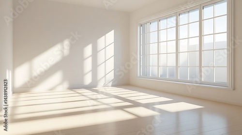 Empty white room with sunlight casting shadows on the floor, perfect minimalistic background for real estate, interior design, and modern home decoration projects