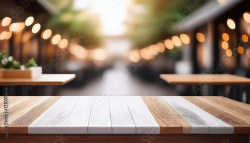 Empty White Table Against a Blurred Background Minimalistic Elegance in a Study Setting, Showcasing Sleek Wood Texture and Empty Serenity at Dusk.