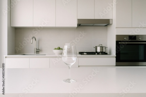Empty wine glass standing on a modern kitchen counter with blurred background featuring oven, stove, sink, and cabinets