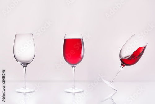 empty wineglass with full and inclined in row on reflective surface and on white