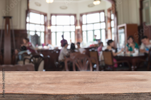 Empty wood table and blurred coffee shop background.